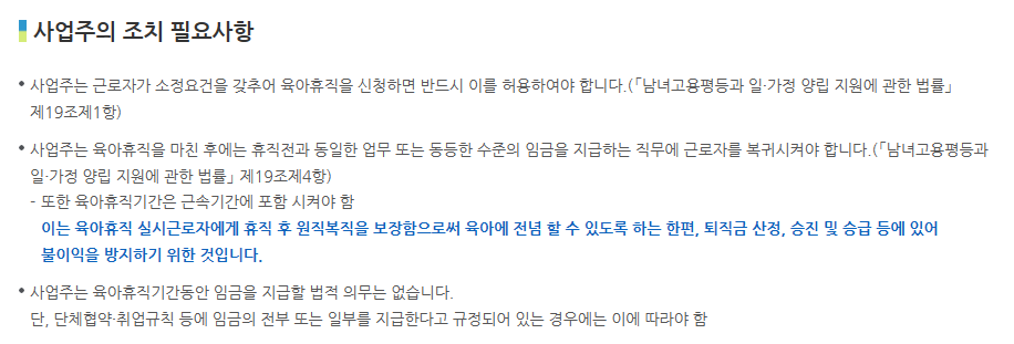 육아휴직을 부여하여 사업주가 받을 수 있는 혜택은 다음 포스팅에서 자세하게 적어보도록하고 육아휴직 소정요건에 대해 알아보겠습니다.