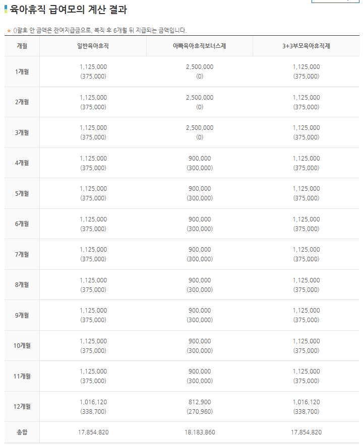 일반육아휴직으로 보면 1,125,000원이 매월 실수령액이고 괄호안의 375,000원은 복직 후 6개월뒤에 받을 수 있는 금액입니다. 모의계산을 해보실 분들은 아래 고용보험 사이트에서 계산해보시면 됩니다.