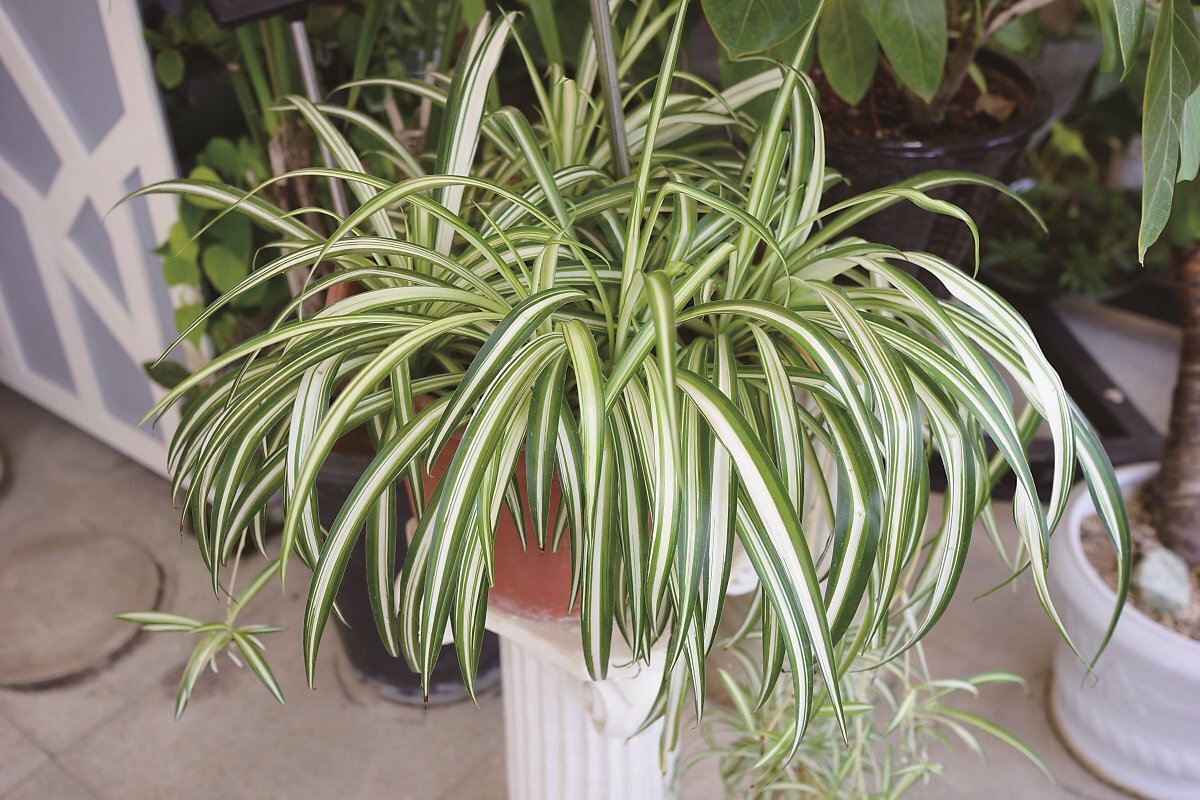 거미 식물: 클로로피텀 또는 거미 식물이라고 불리는 이녀석은 기르기 쉽고 손이 많이 가지않습니다. 그만큼 관리가 쉽다는 이야기죠. 거미식물은 공기로부터 포름알데히드와 자일렌을 제거하는 능력으로 알려져 있습니다. 직접 햇빛에 노출하는것 보다는 실내에서 간접적인 햇빛 아래서 기르는게 좋고 일주일에 한번씩만 물을 주면 됩니다.